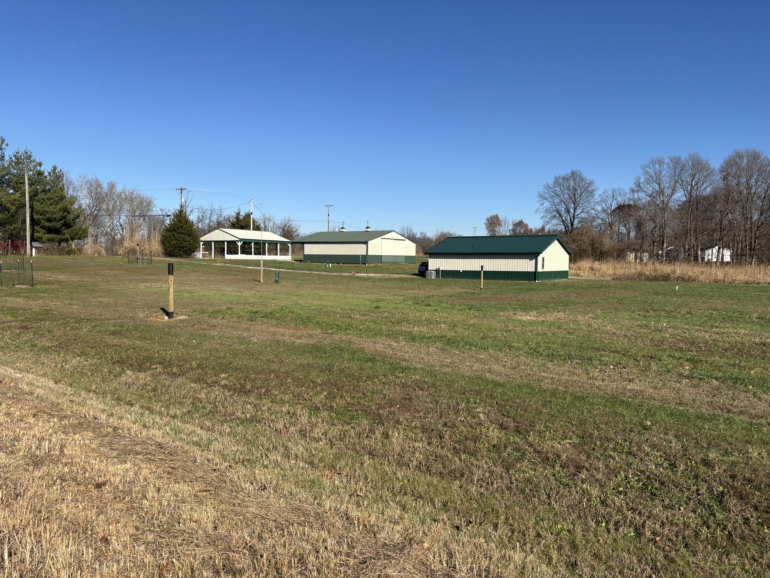 “Bogus” property view. Buildings (left to right) - open sided plant pavilion, pole barn, and cabin.