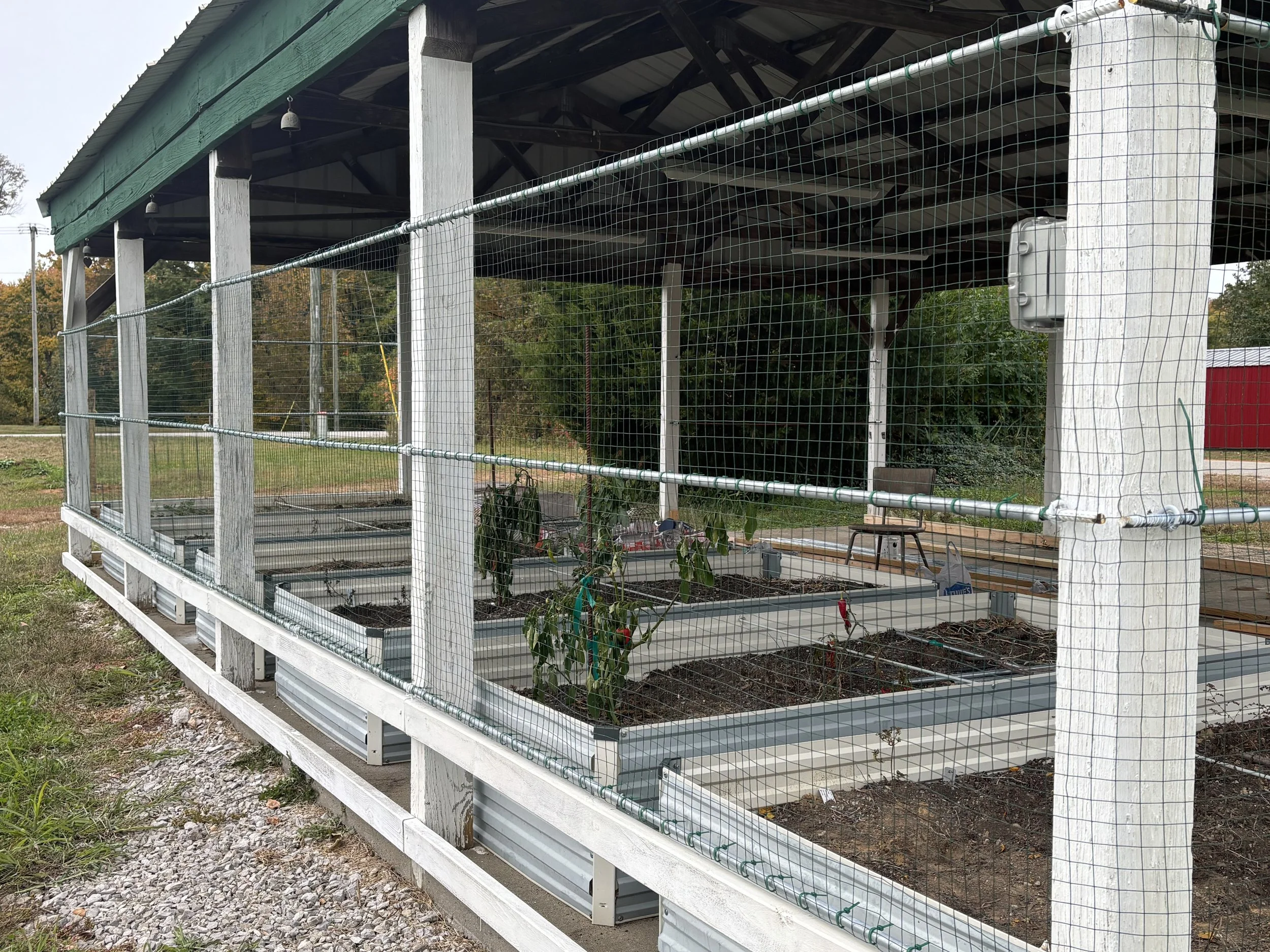 This is a pavilion within which garden beds were placed and planted this past spring and summer (‘25). The upcoming project will enclose the 24’ x 32’ covered area with wood and screening to prevent the various pests in the area (rabbits / squirrels / racoons / deer / groundhogs) from raiding the planting beds. The front half may be converted to house half a dozen chickens and store garden tools and supplies. Water and electricity have been added to the pavilion over recent years in preparation for the completed project.
